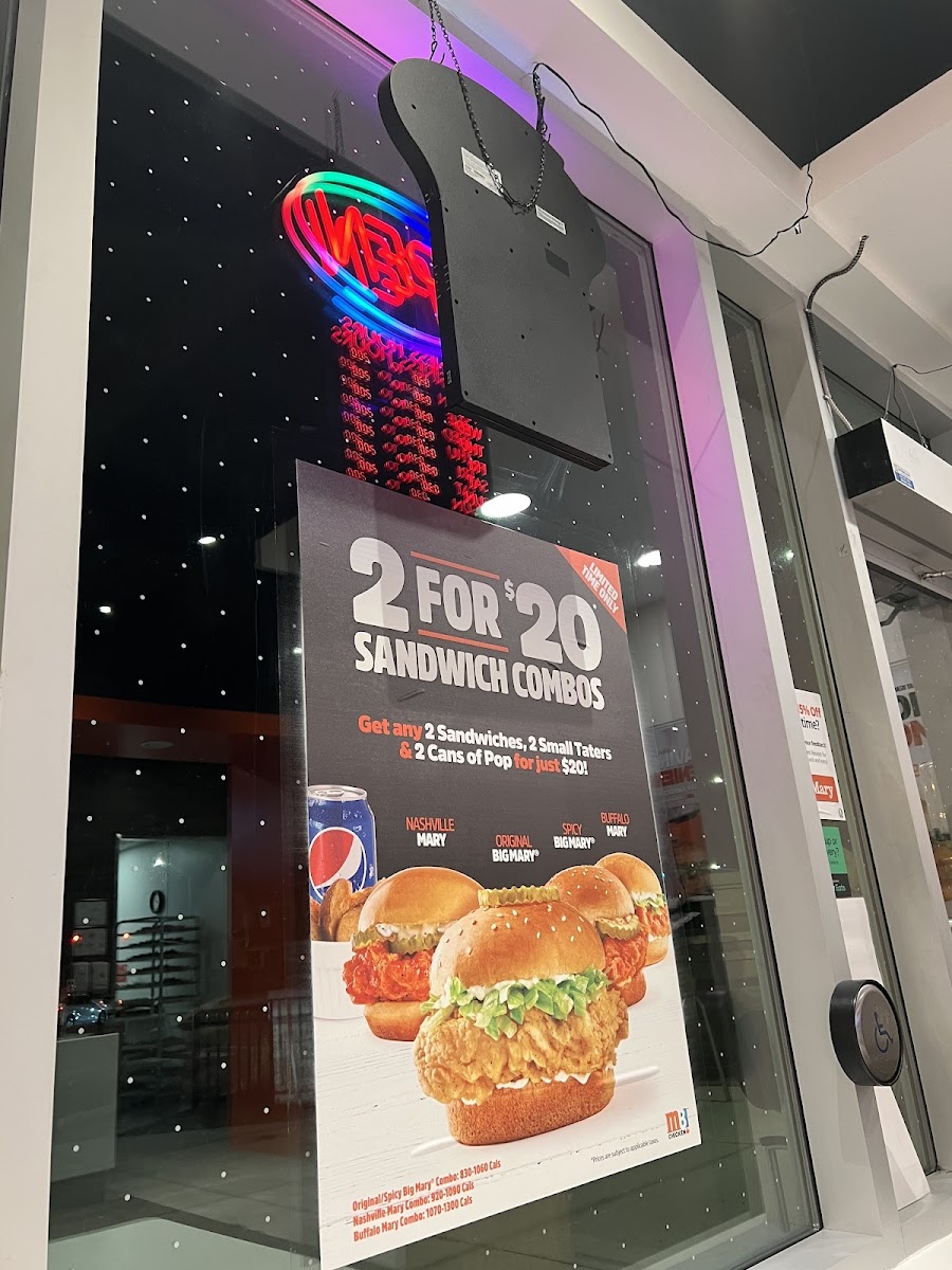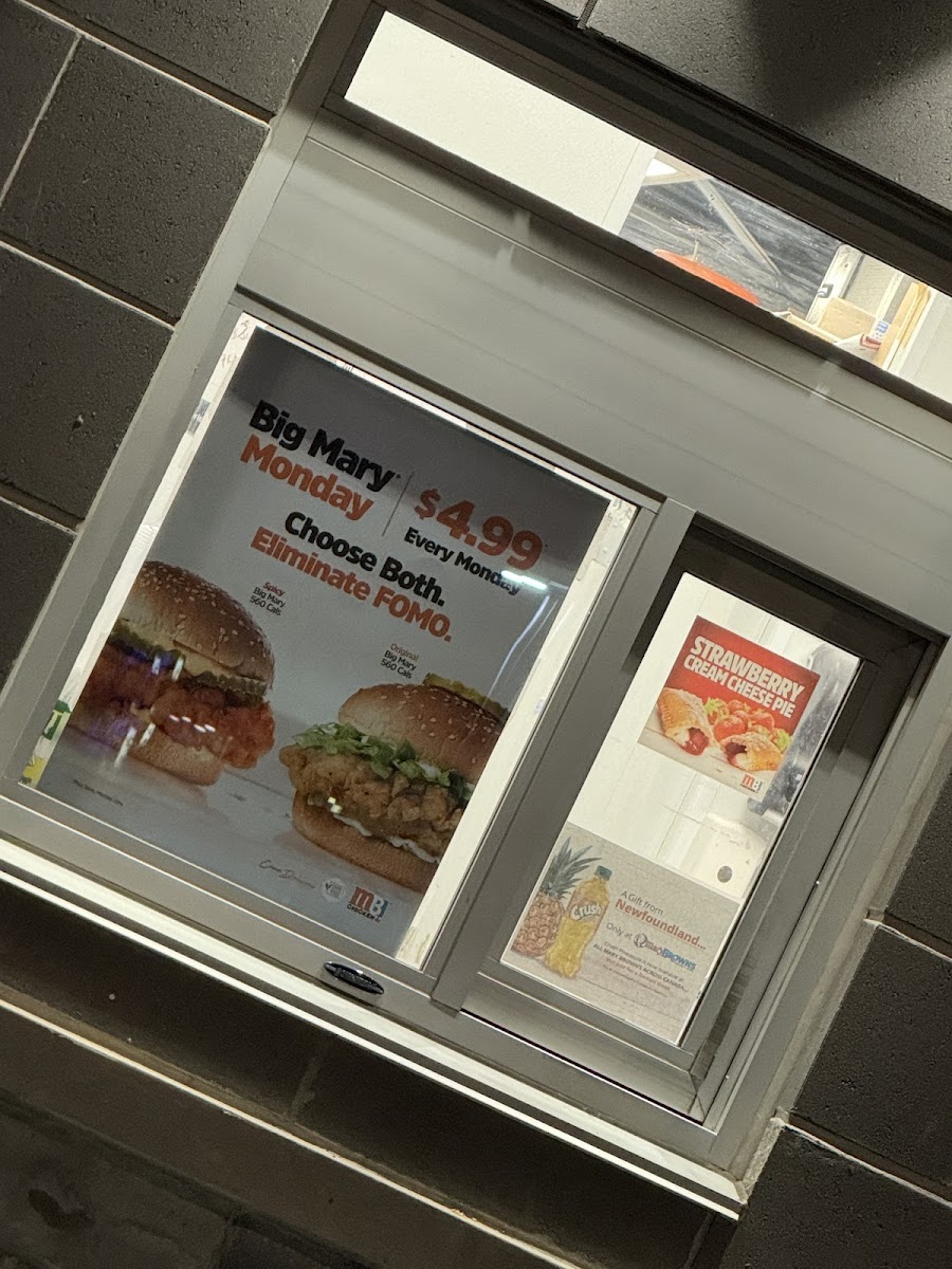 A Spicy Big Mary sandwich with your choice of small taters or fries and a can of pop. 1070-1130 cal.