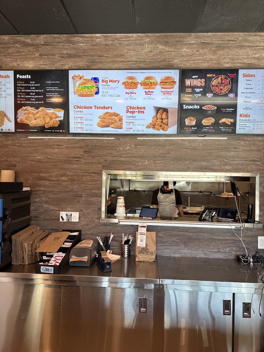 A Big Mary whole breast filet, slathered in spicy buffalo sauce, paired with blue cheese dressing, and topped with crunchy lettuce, served on a new brioche bun. 810 cal.